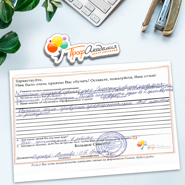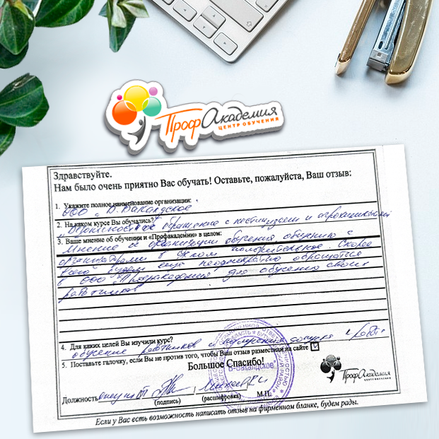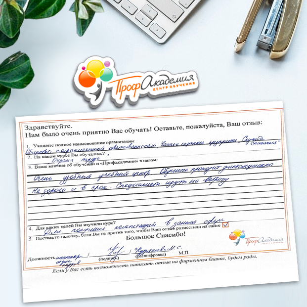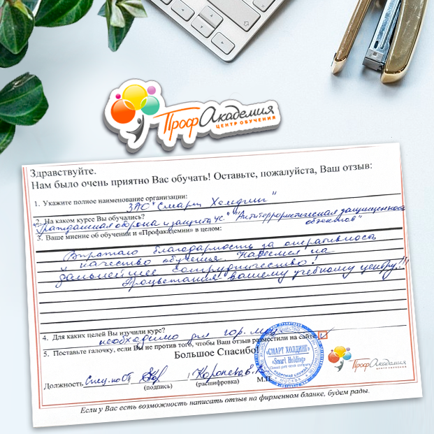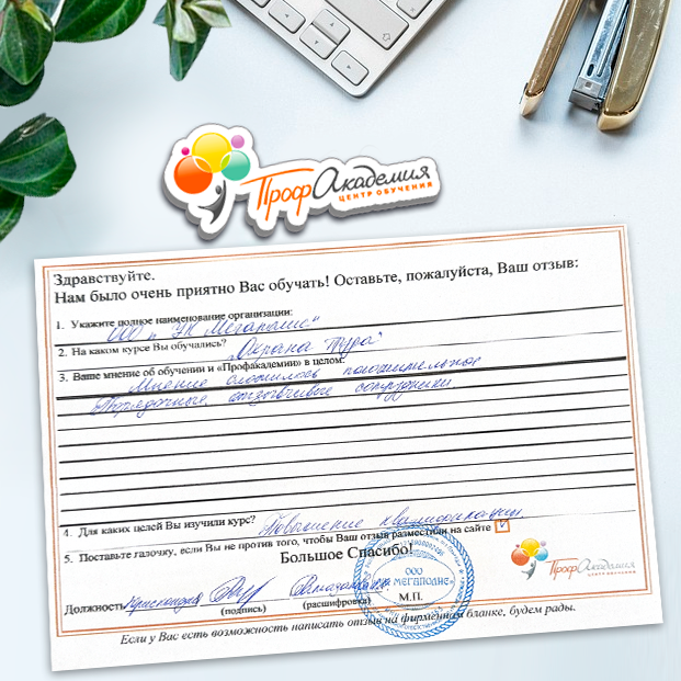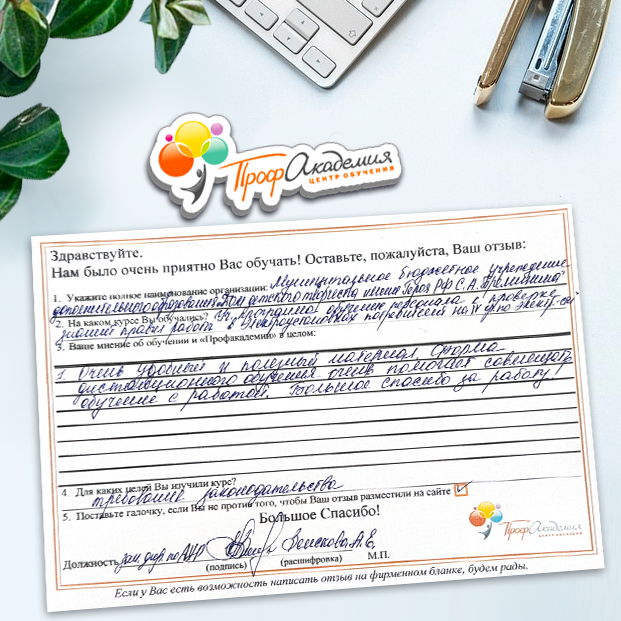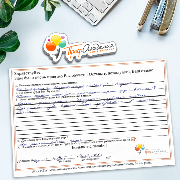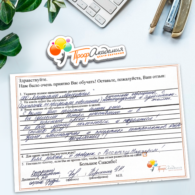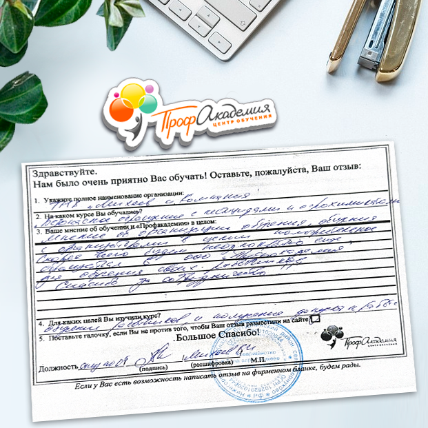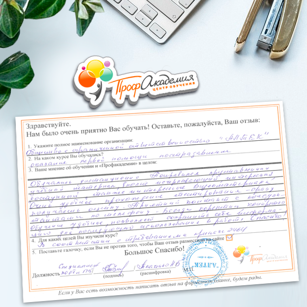 Спасибо Профакадемии за доступное обучение, наши сотрудники с легкостью прошли все курсы, информация в виде презентаций изложена очень четко, лаконично и быстро усваиваться. Мы уже стали Вашими постоянными учениками, будем и дальше взаимодействовать. С вами приятно работать