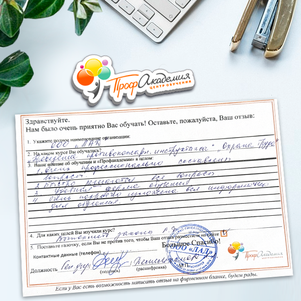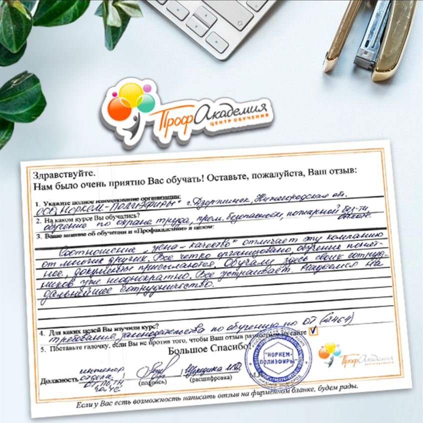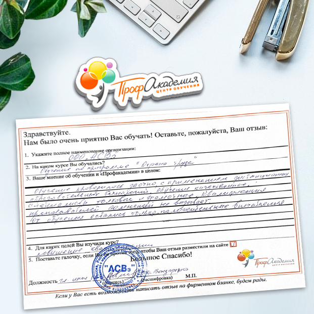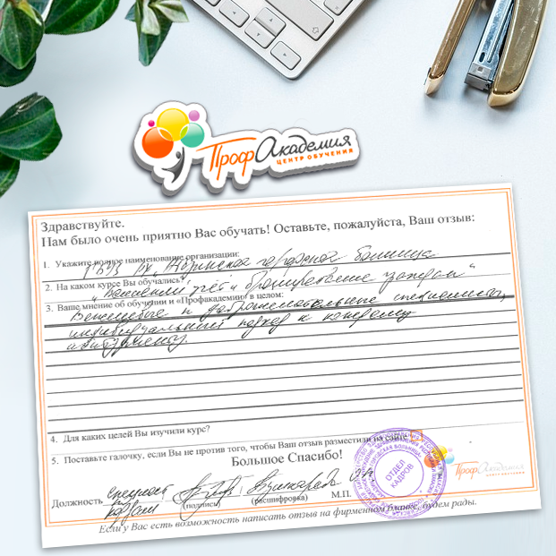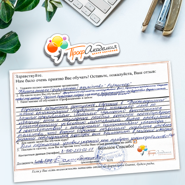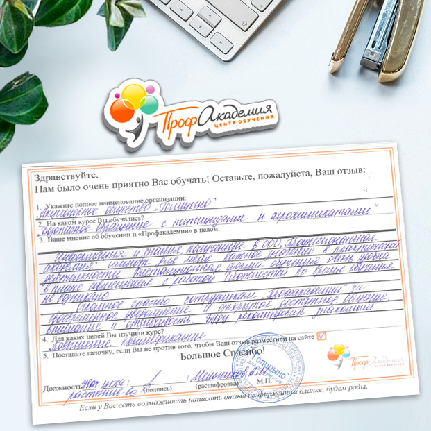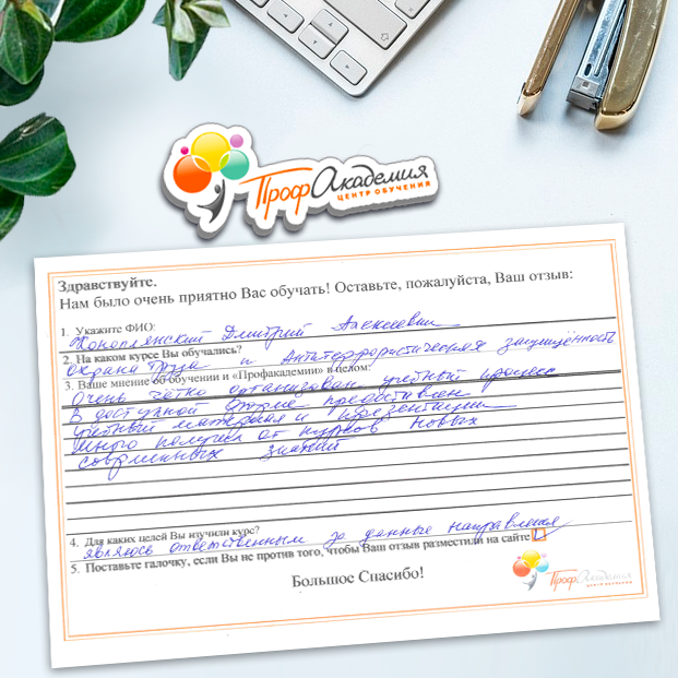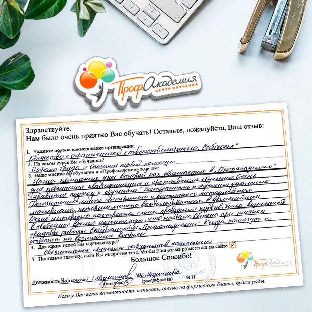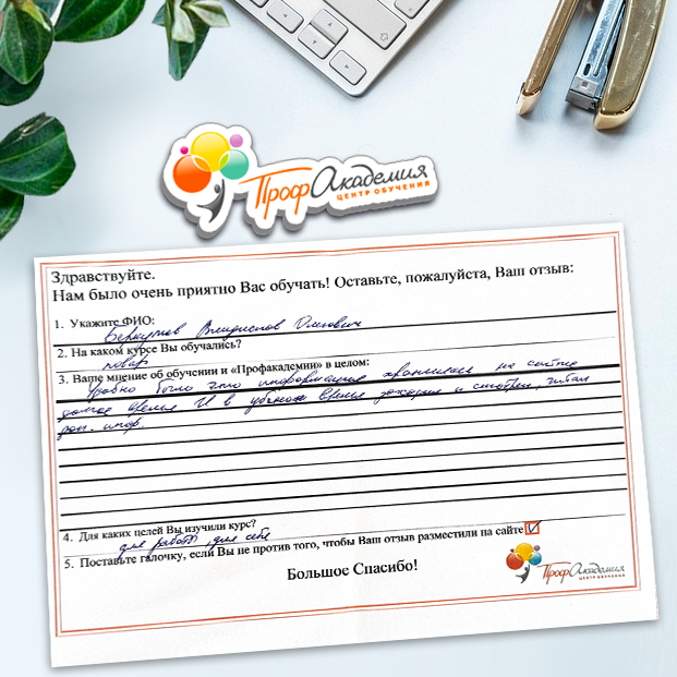 Спасибо Профакадемии за доступное обучение, наши сотрудники с легкостью прошли все курсы, информация в виде презентаций изложена очень четко, лаконично и быстро усваиваться. Мы уже стали Вашими постоянными учениками, будем и дальше взаимодействовать. С вами приятно работать