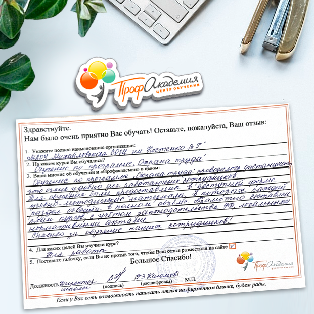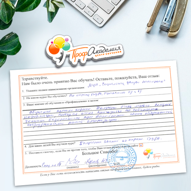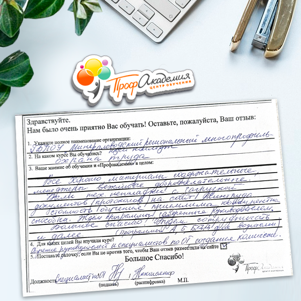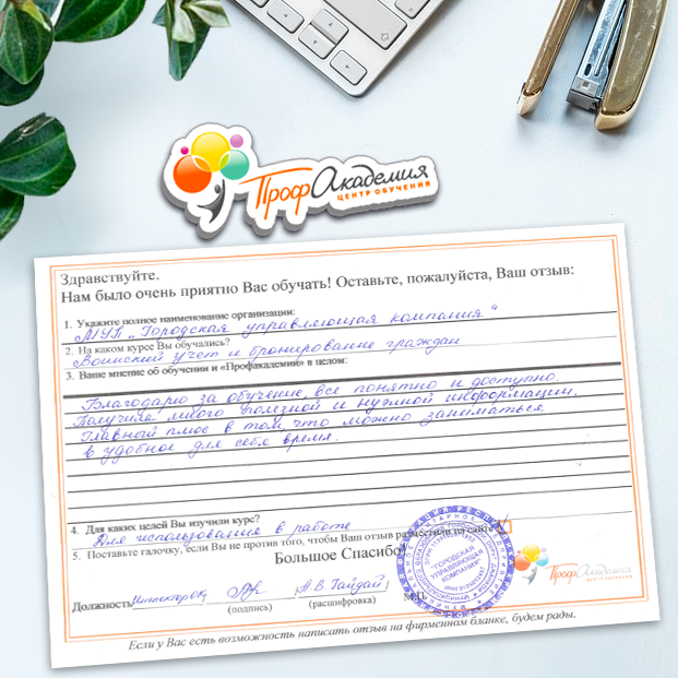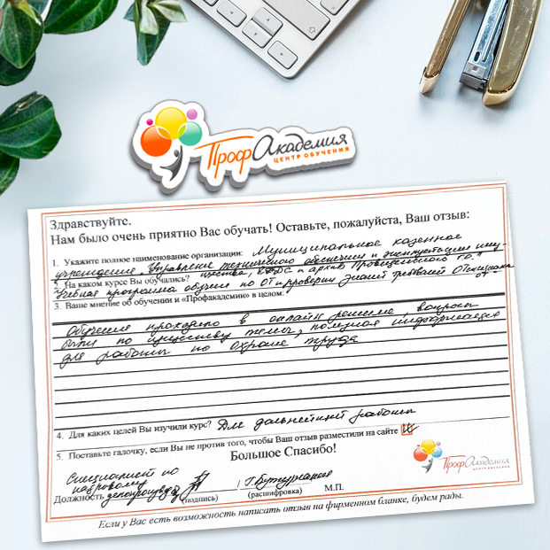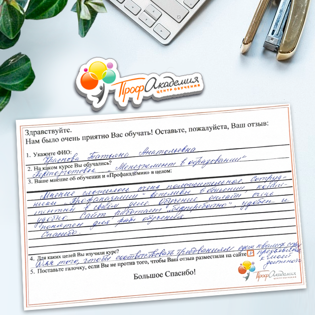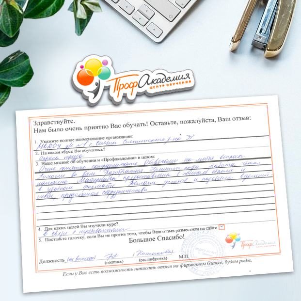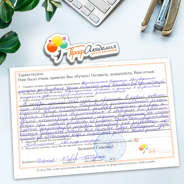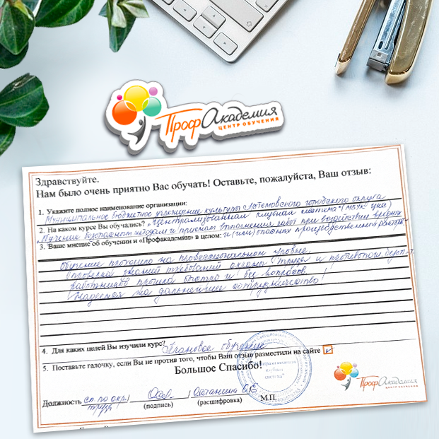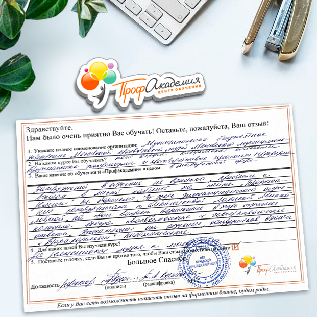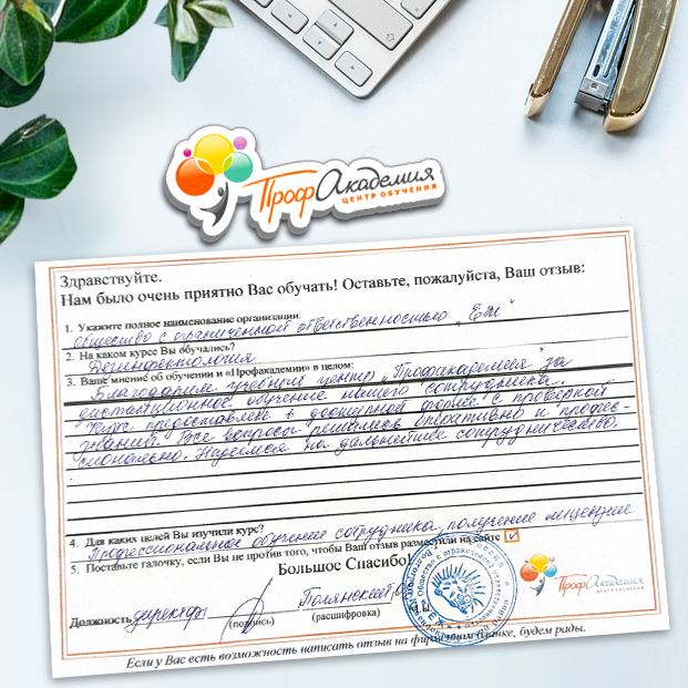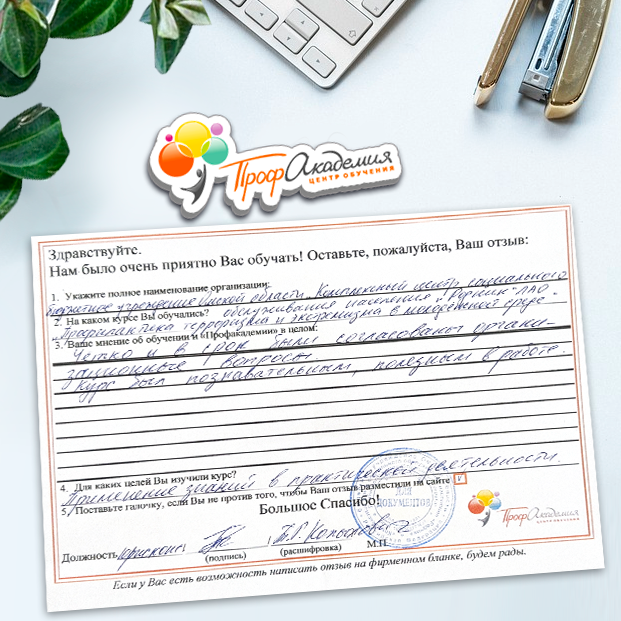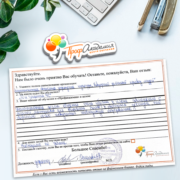 Для прохождения дополнительного профессионального образования для руководителя обращаемся в Профакадемию почти 10 лет. Хотим отметить высокий профессионализм сотрудников, доброжелательность и надежность. Команда работает качественно, без задержек и накладок. Спасибо за ваш труд! Успехов и процветания!