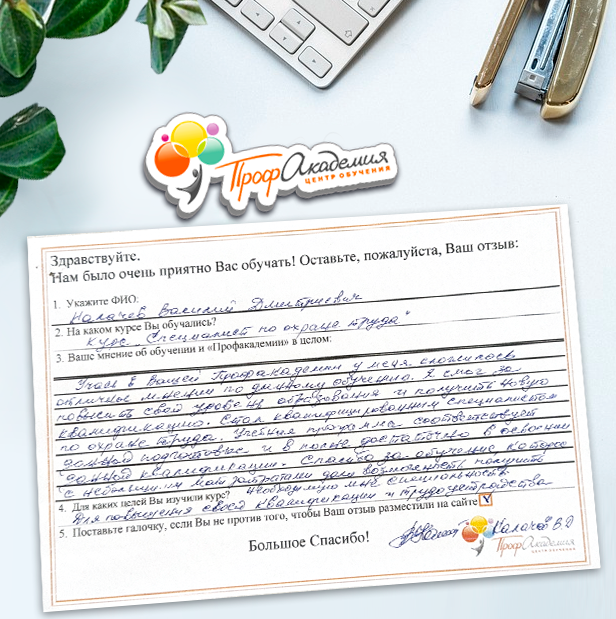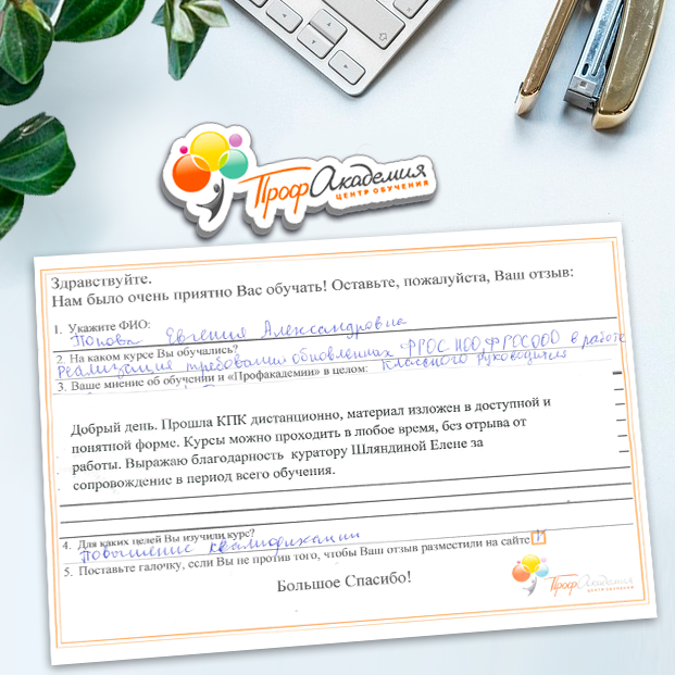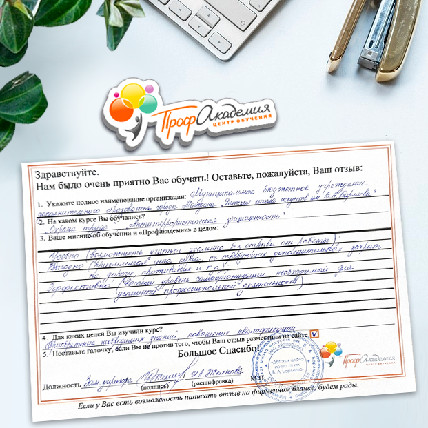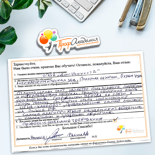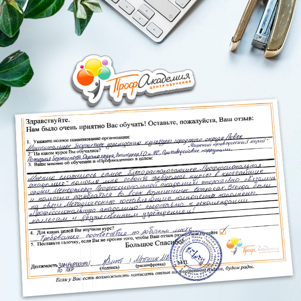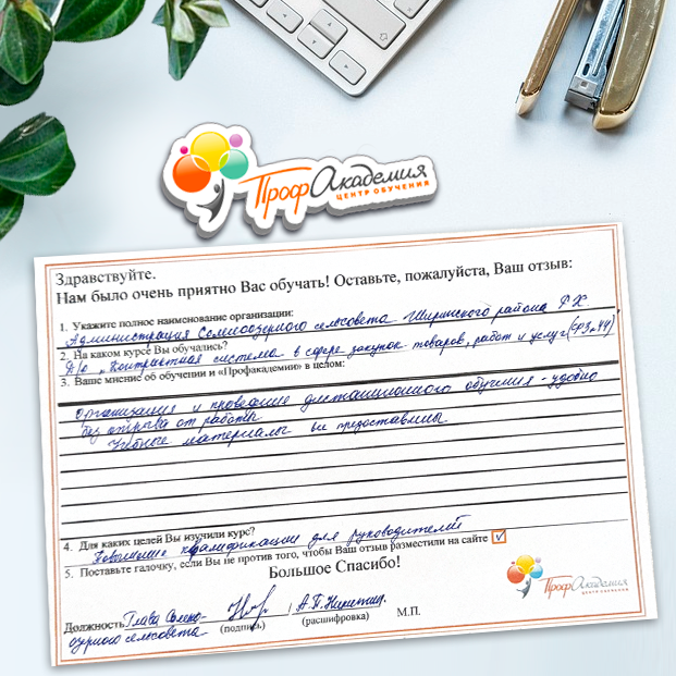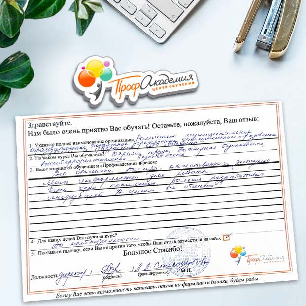 Выражаю благодарность за отлично проведенную работу по повышению квалификации. Можно отметить высокую квалификацию преподавательского состава, четкую и профессиональную работу специалистов "Профакадемии" при организации учебного процесса, а также качество профессиональных знаний. Мы благодарим за высокопрофессиональный подход и качественную подачу материала