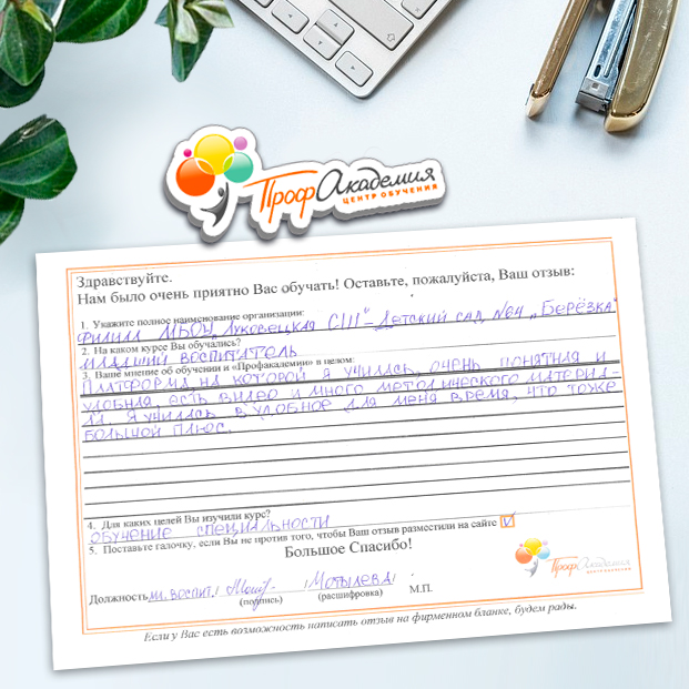 Осталась довольна сотрудничеством с Вашей компанией. Оперативность в работе, обязательность и профессионализм. Обучение прошло в доступной форме, интересно и познавательно. Спасибо всей вашей команде.