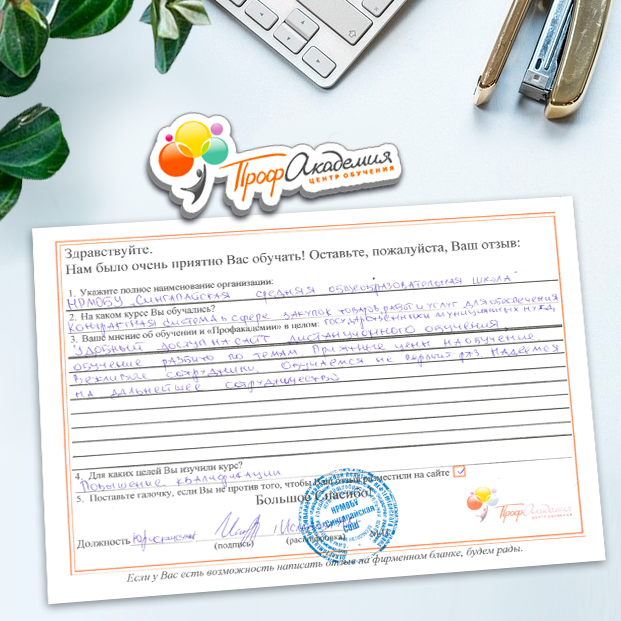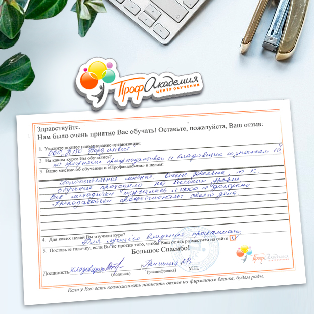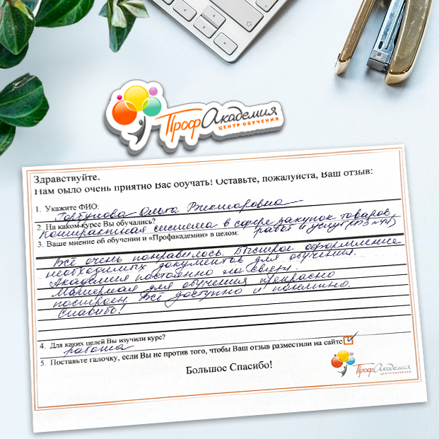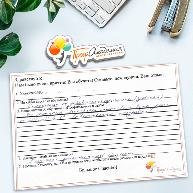 Не первый год сотрудничаем с "Профессиональной Академией". Хочется отметить сотрудников Академии за отзывчивость и оперативность в работе, и за доброжелательность к обращающимся к ним людям. Обучение - понятное и эффективное. Спасибо большое.