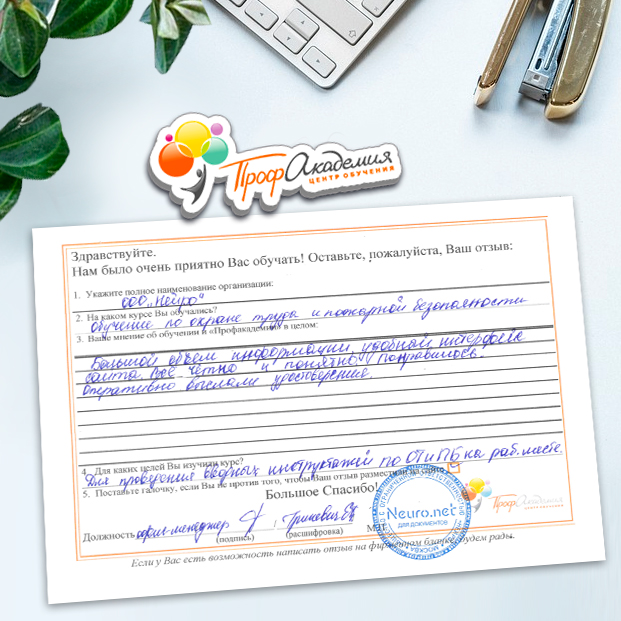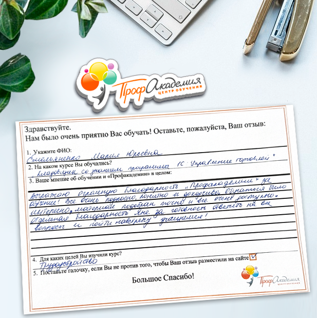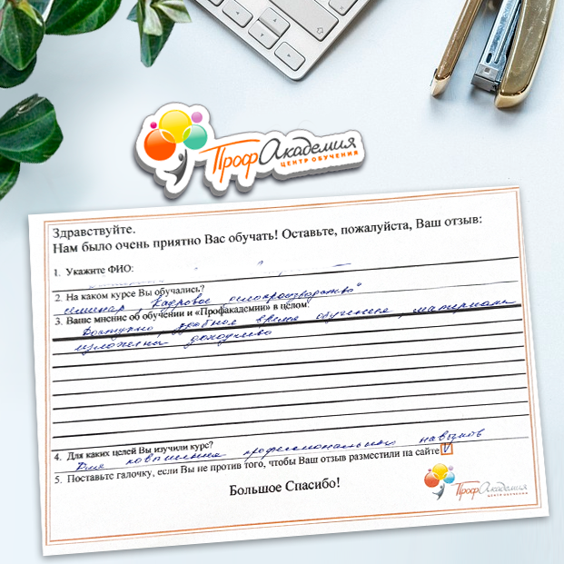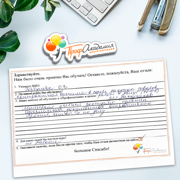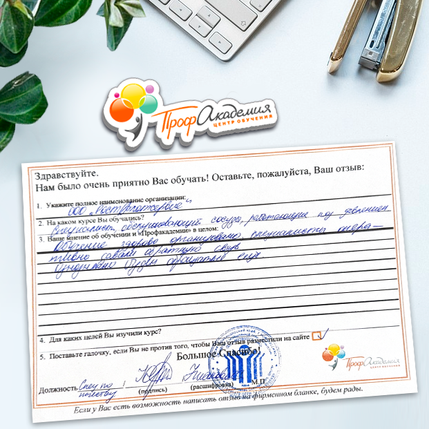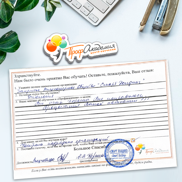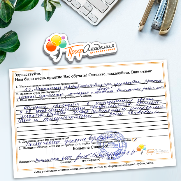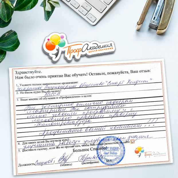 Наши сотрудники неоднократно проходили обучение в Вашей академии и с огромным удовольствием вернемся к Вам снова. Все доступно, понятно и отлично! Большое спасибо!