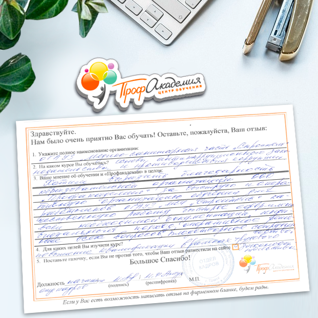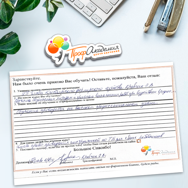 Обучение в "Профакадемия" стало для нас одним из важнейших этапов в нашей библиотечной жизни и всего Учреждения в целом. Высокая квалификация преподавателей и база знаний помогают нам сегодня в работе. Ваши педагоги компетентные, доброжелательные, грамотные и знающие свое дело. Те знания, которые вы нам даете, действительно, очень помогают в работе. Хотим выразить огромную благодарность всему вашему коллективу за внимание, знания, прекрасное отношение. Желаем ООО "Профакадемия" дальнейшего процветания и дальнейшего сотрудничества!