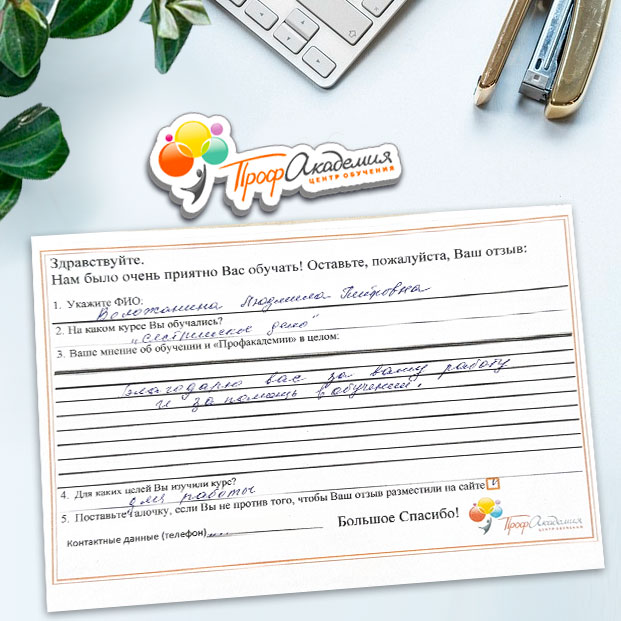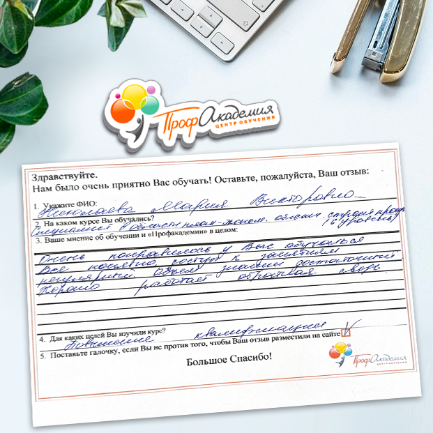 Хочу выразить огромную благодарность всей группе Профакадемии. Понравилось все. Вся информация об обучении находится в доступной форме. Очень боялась когда нашла обучение, но все оказалось намного проще. Надеюсь все что изучила за время обучения станет замечательным фундаментом для моей новой жизни.