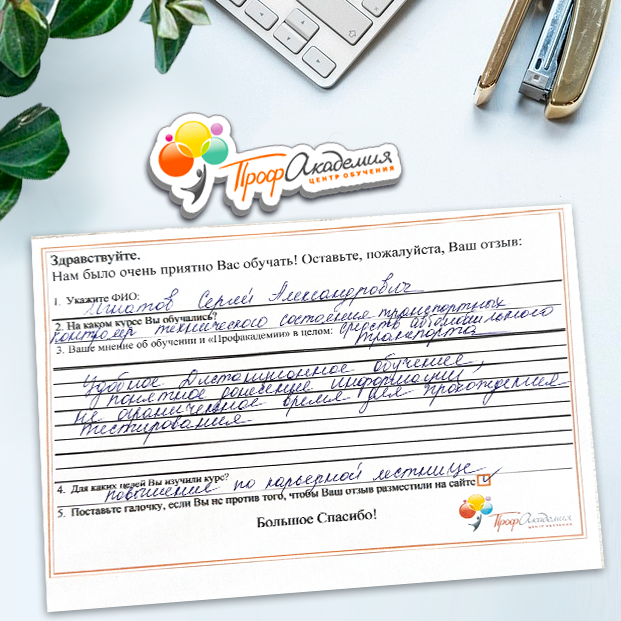 Спасибо за обучение, желаю вашей команде не останавливаться на достигнутом и дальнейшего процветания , с вами было легко и приятно учиться очень внимательно подходили к моим вопросам и оперативно и профессионально давали обратную связь, это очень важно. Вы большие молодцы