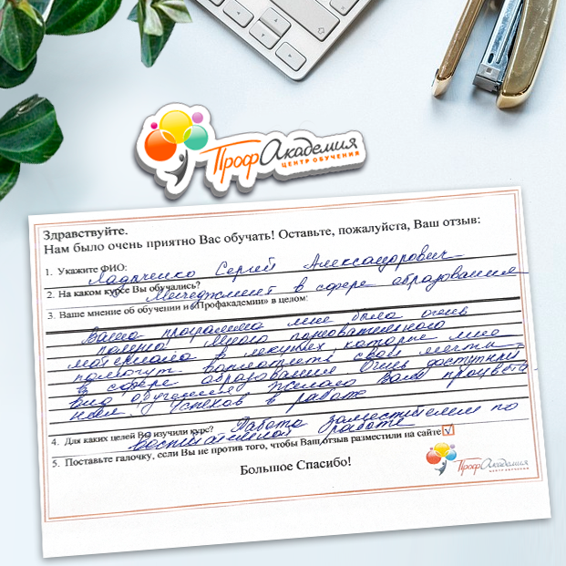 Огромное спасибо за очень доступный, интересный, объемный курс обучения. Самое главное, что учиться можно в удобное для себя время, не прерывая свою трудовую деятельность.